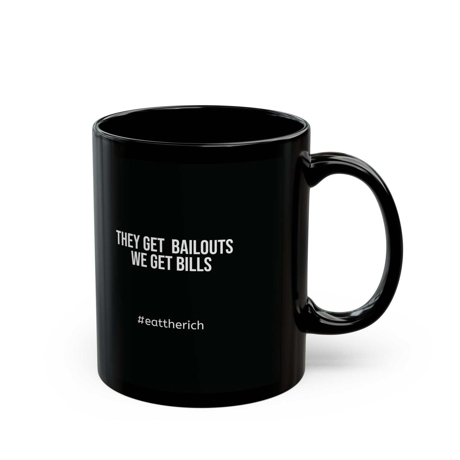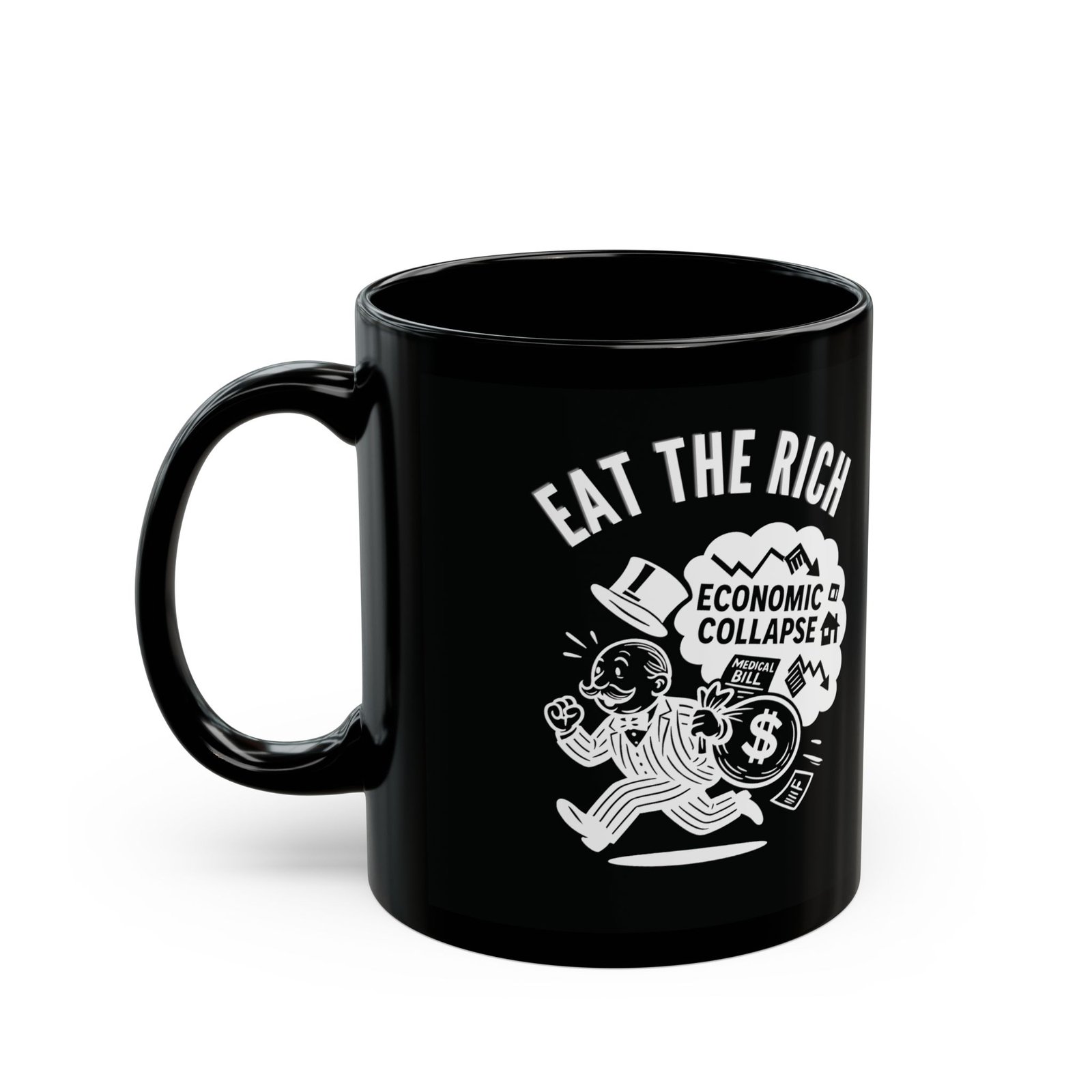 This mug is for rebels, radicals, and Monday-morning doomscrollers who prefer their truth with coffee. Featuring a white line-art design of the Capitalist Rich Gent running from a cartoon cloud of financial disaster, this anti-capitalist mug turns your morning brew into a protest.