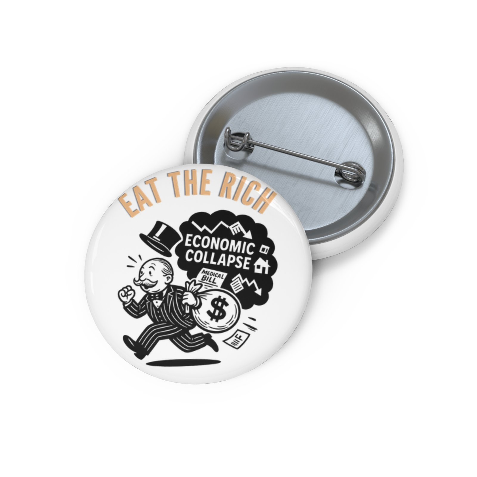 This white protest button features a black line art design of our wealthy runaway bolting from a swirling cloud of economic doom. Arched over him in bold caps: