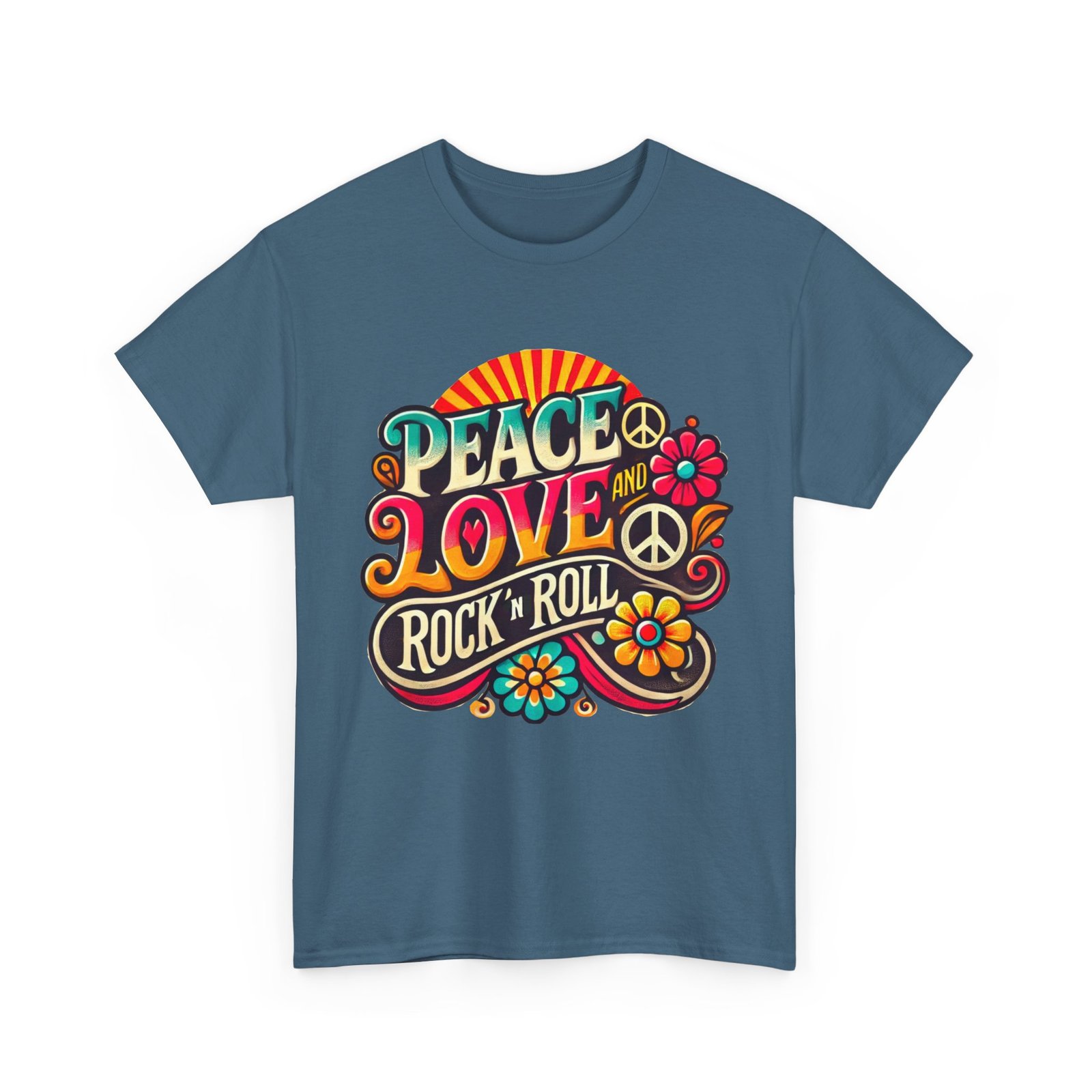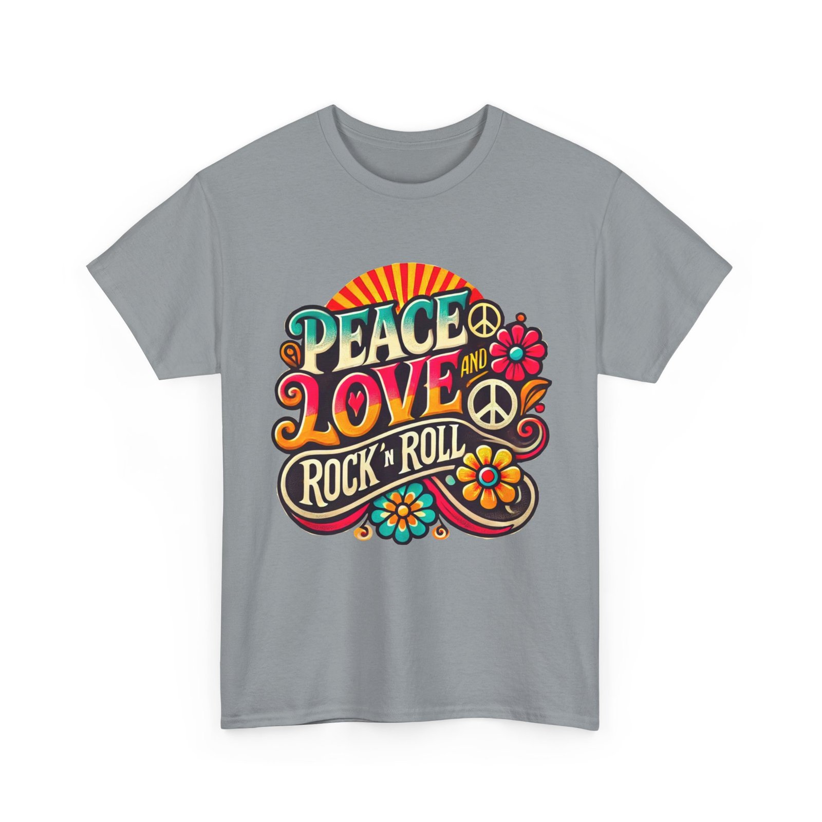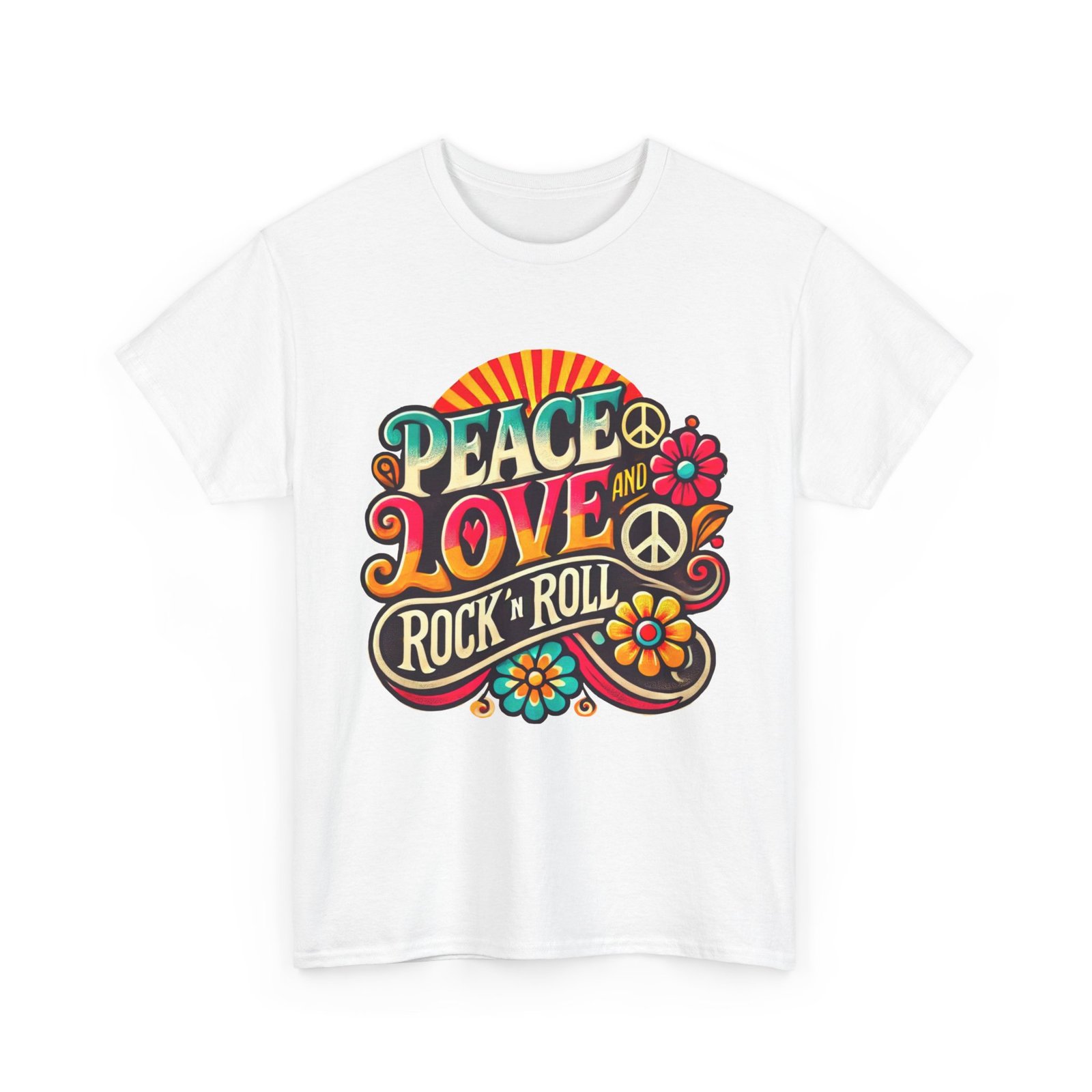 Peace, Love & Rock ’n’ Roll — the ultimate 60s anthem, now in vibrant rainbow sunrise and groovy retro lettering. This psychedelic T-shirt is a colorful nod to the Summer of Love, perfect for old-school rockers, festival fans, and anyone still feelin’ the vibe. Bold, bright, and Boomer-approved.